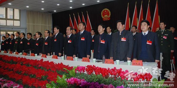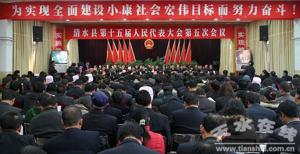 。ㄇ逅h委對(duì)外宣傳辦公室 楊兆康 張建新)1月6日上午,清水縣軒轅賓館北二樓會(huì)議室洋溢著和諧奮進(jìn)的氣息,十面鮮艷的紅旗簇?fù)碇腥A人民共和國(guó)國(guó)徽,相互輝映,莊嚴(yán)喜慶,格外醒目,主席臺(tái)前鮮花簇?fù),生機(jī)勃勃。上午8點(diǎn)30分,備受全縣人民關(guān)注和期待的清水縣第十五屆人民代表大會(huì)第五次會(huì)議在雄壯的國(guó)歌聲中隆重開幕。