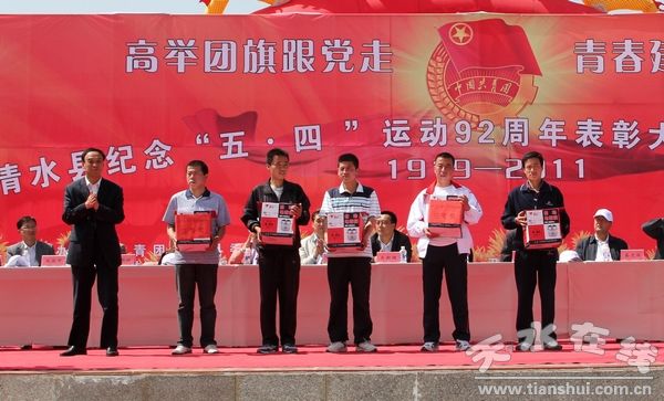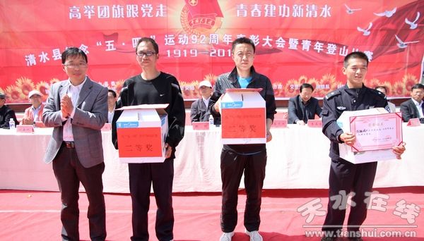 (縣政府副縣長安和平為登山比賽男隊二等獎獲得者頒獎)