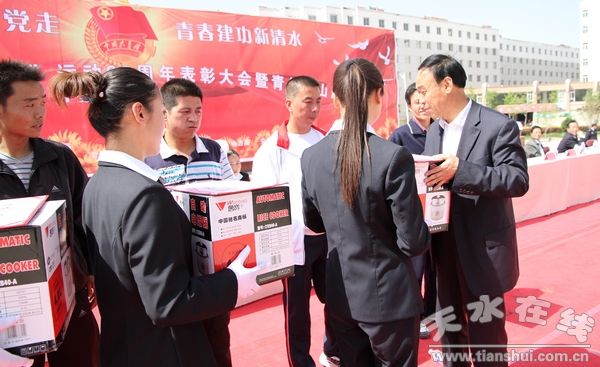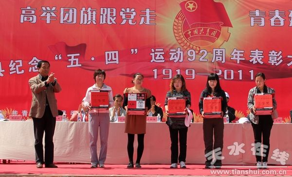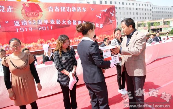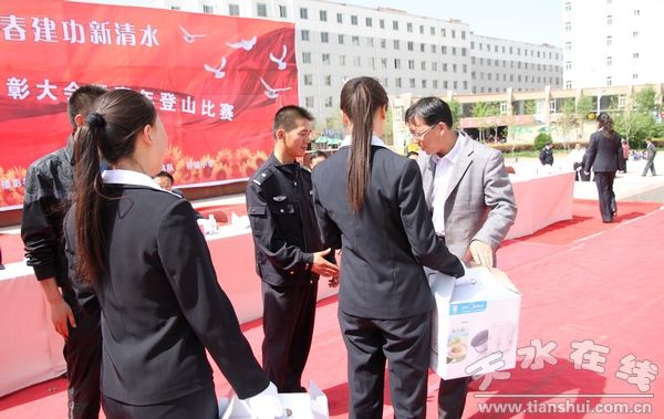 (縣人大副主任趙愛平為登山比賽女隊三等獎獲得者頒獎)
