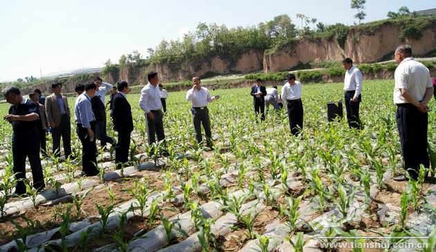 觀摩團(tuán)在清水縣中部萬畝全膜雙壟溝播種玉米示范基地現(xiàn)場觀摩