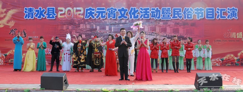 2月5日下午,清水縣軒轅廣場歌如潮、人如海,由中共清水縣委、縣人民政府主辦,甘肅省京劇院、清水縣委宣傳部、縣文廣局承辦的2012年 “慶元宵”大型文藝演出正在這里舉行。文藝演出在《金獅鬧元宵》中拉開序幕。省京劇院演員精彩的表演贏得在場觀眾的陣陣掌聲。獨(dú)唱《西部情歌》、《咱老百姓》和縣歌《我家清水門前流》等歌曲,熟悉的旋律和歌聲,讓現(xiàn)場的觀眾緊跟著音樂的節(jié)奏舞動(dòng)著,跟著輕唱。舞蹈《歡慶》、《西班牙舞》、《雪域高原》歡快的舞姿,喜慶的音樂,讓現(xiàn)場一片沸騰。魔術(shù)《和平使者》、《東北二人轉(zhuǎn)》、《變臉》、京劇清唱《杜鵑山》讓觀眾大開眼界,將整臺演出推向高潮。演出在花兒《清水的牡丹紅燦燦》和《我家清水門前流》的歡快節(jié)奏中落下帷幕。