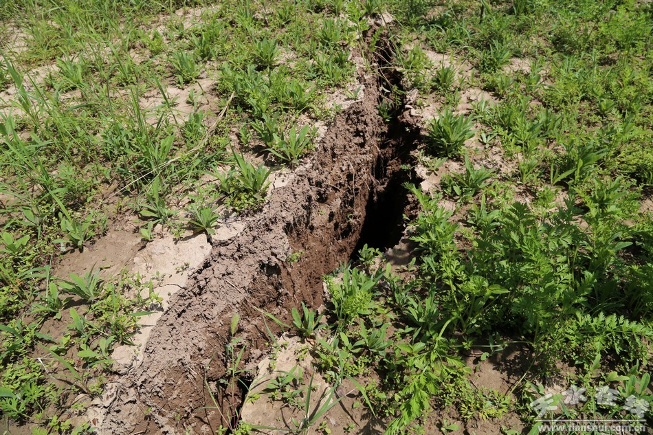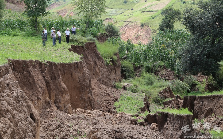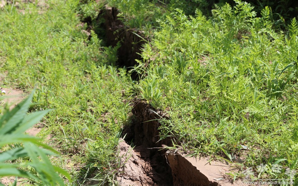 (夜明村曹王自然村地下溝出現(xiàn)長約50米,寬約15米,深度約10米左右的大裂縫,曹王自然村整個村莊處在危險地帶) |