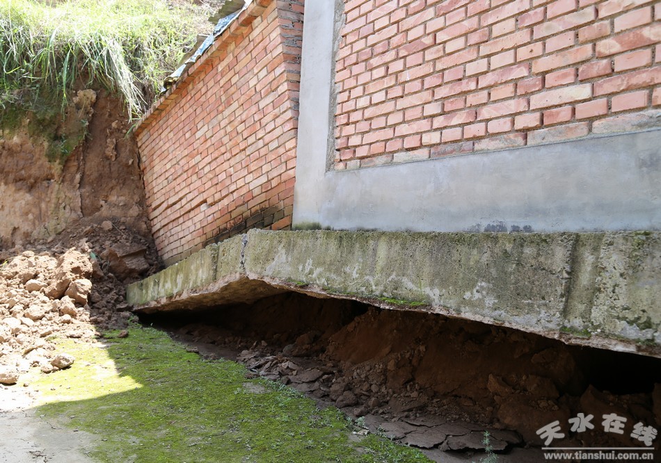(夜明村曹王自然村所在的山體嚴(yán)重滑坡,村民住房嚴(yán)重?fù)p毀,房屋一端的地基離地面約50厘米)