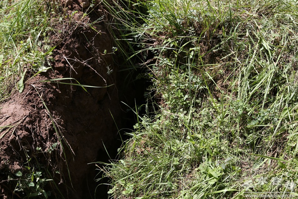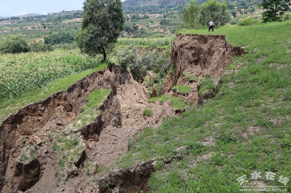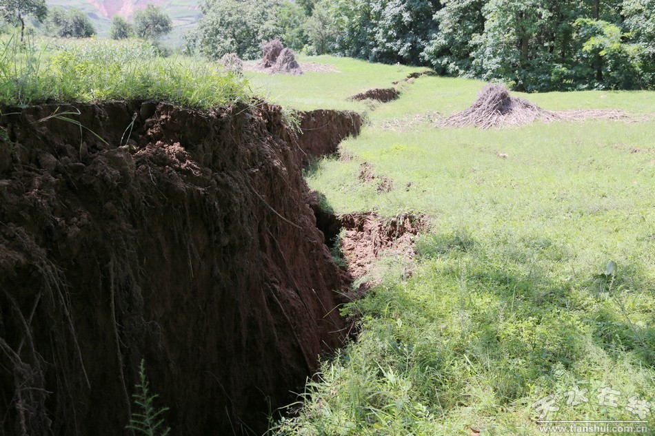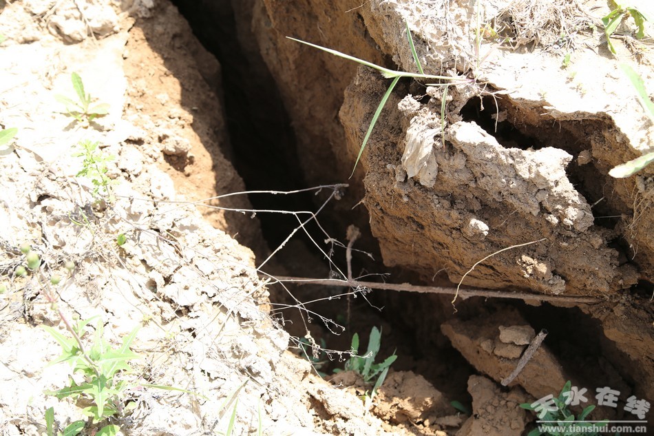 (夜明村曹王自然村地下溝出現(xiàn)長約50米,寬約15米,深度約10米左右的大裂縫,曹王自然村整個村莊處在危險(xiǎn)地帶) |