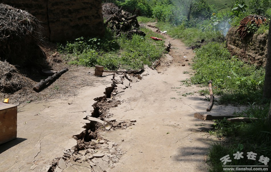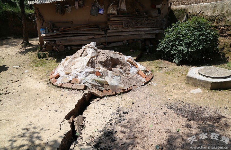 (夜明村曹王自然村所在的山體嚴(yán)重滑坡,山體下滑近兩米,山坡出現(xiàn)很多大裂縫一直延伸到村莊,曹王自然村整個村莊處在危險(xiǎn)地帶)