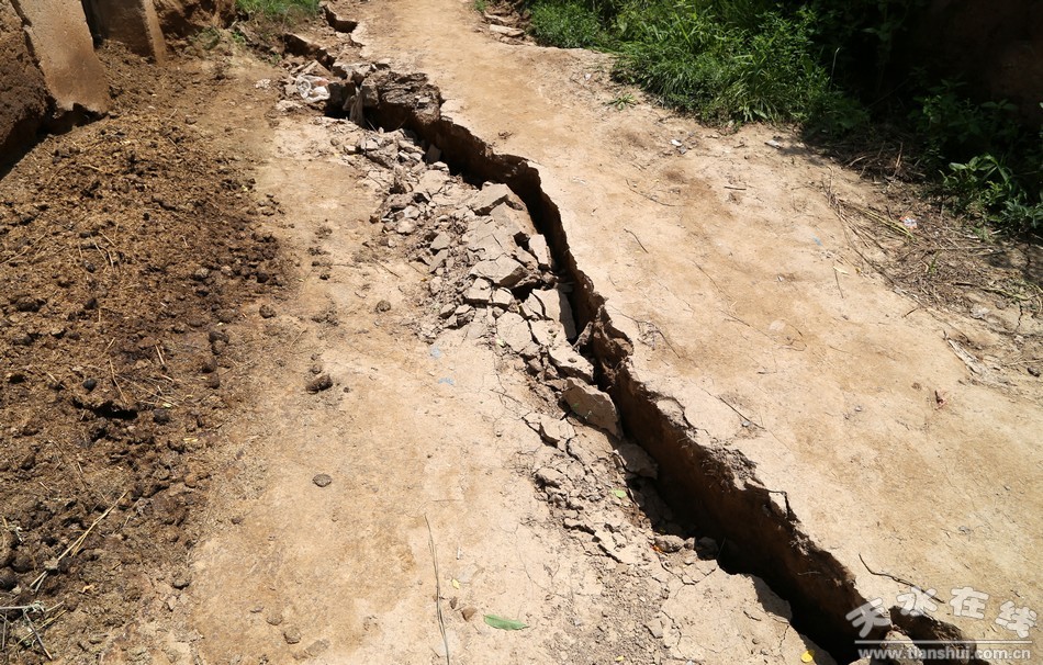 (夜明村曹王自然村所在的山體嚴(yán)重滑坡,山體下滑近兩米,山坡出現(xiàn)很多大裂縫一直延伸到村莊,曹王自然村整個(gè)村莊處在危險(xiǎn)地帶)