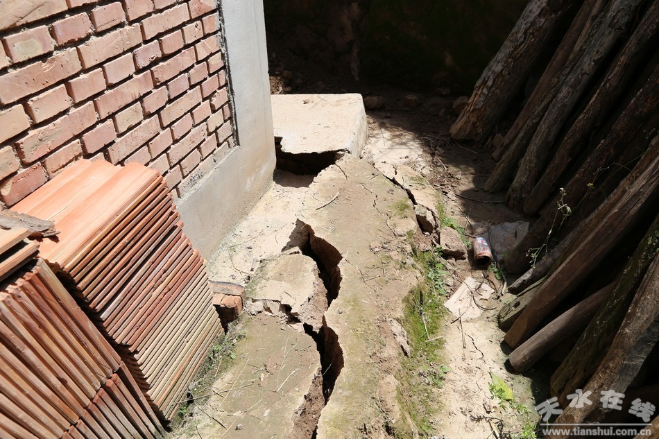 (夜明村曹王自然村所在的山體嚴(yán)重滑坡,村民院子里出現(xiàn)大裂縫,新建的房屋嚴(yán)重?fù)p毀)