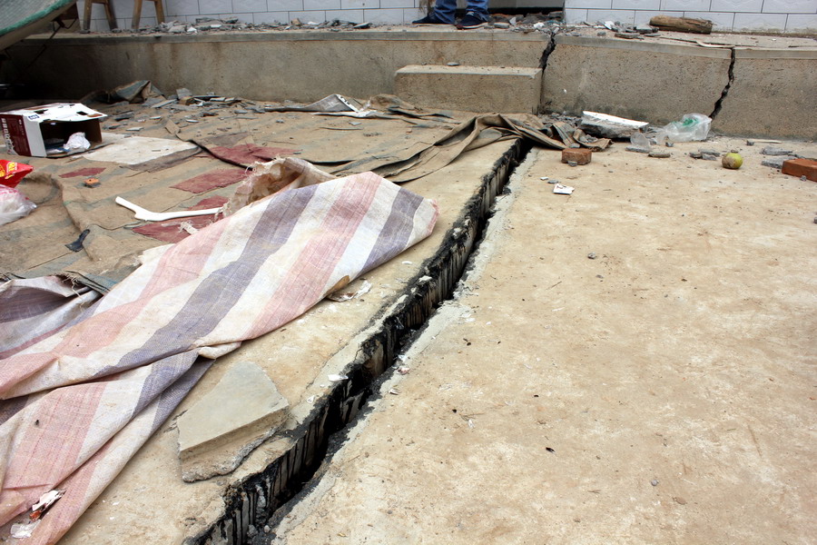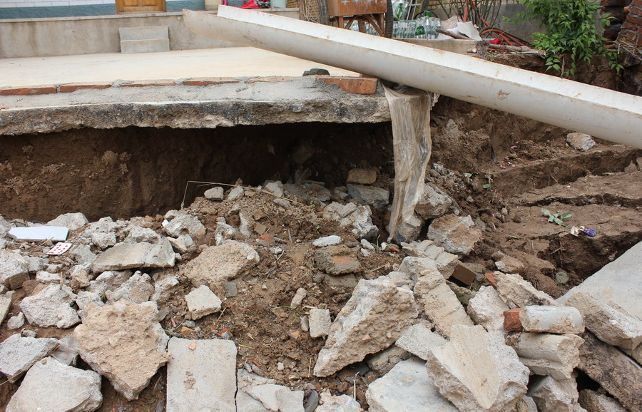(副縣長何敬忠查看災情,磨上咀村地面嚴重下陷房屋倒塌)