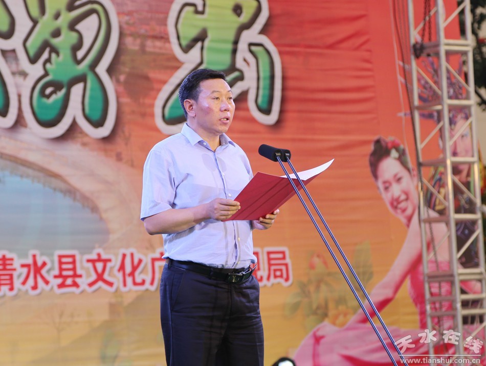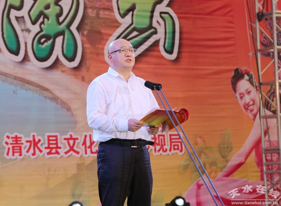 在文藝演出開始前,甘肅省文化館館長陳化平做了講話,陳化平說,近年來,清水縣在黨和政府的關(guān)懷下,以創(chuàng)建省級文明縣為契機,始終把精神文明建設(shè)擺上重要議事日程,切實加強對精神文明建設(shè)工作的引導和推進,積極探索精神文明建設(shè)的新特點、新路線,不斷增強工作的針對性和實效性。為滿足全縣廣大群眾業(yè)余文化生活需求,使公民道德建設(shè)深入人心,先后舉辦了秦腔票友電視大賽等一系列文化活動,不僅營造了濃厚的宣傳氛圍,提高了宣傳教育質(zhì)量,更是把方便、實惠和文化帶給了老百姓。