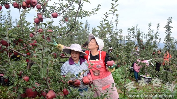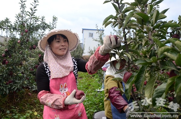 薛淑琴是麥積區(qū)人,之前一直和丈夫兩人從事蘋果收購生意,30多年的走南闖北讓夫妻倆積累了豐富的蘋果銷售經(jīng)驗,也讓他們看到了種植蘋果可觀的經(jīng)濟效益。2012年,她從別人手里轉讓了這片果園的經(jīng)營權,憑借著夫妻兩多年耳濡目染學到的種植技術!瓣惣臆恋胤饰郑庹粘渥,交通便利,是果樹生長的最佳適宜地區(qū),而且這里山好水好無污染,我們把這個土地流轉過來種植蘋果以后,也帶動當?shù)乩习傩盏木蜆I(yè),現(xiàn)在就有40幾個人在我們這里長年務工,”薛淑琴說。