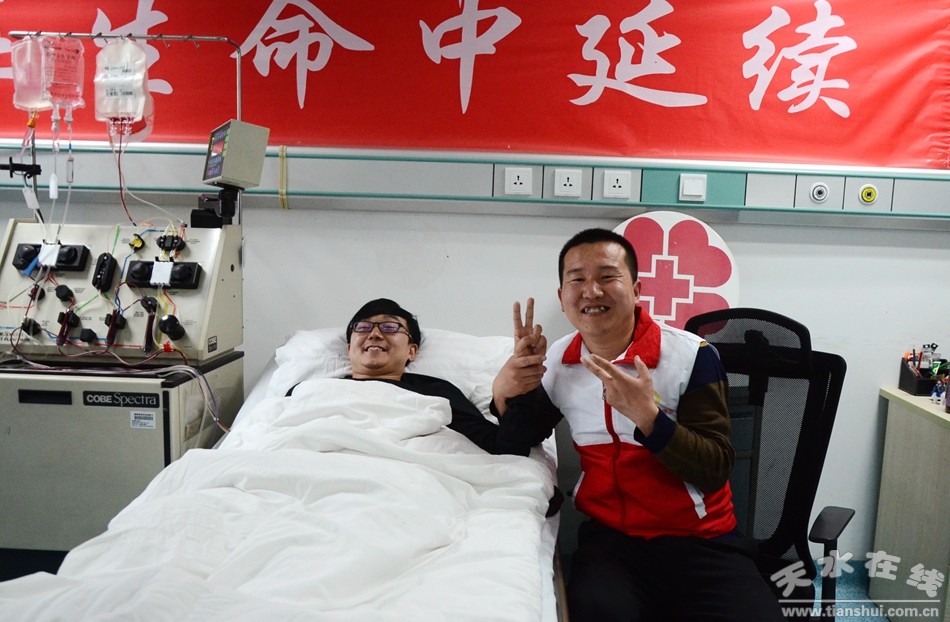 (李宏偉與正在采集造血干細(xì)胞的志愿者王輝互相加油鼓勁)