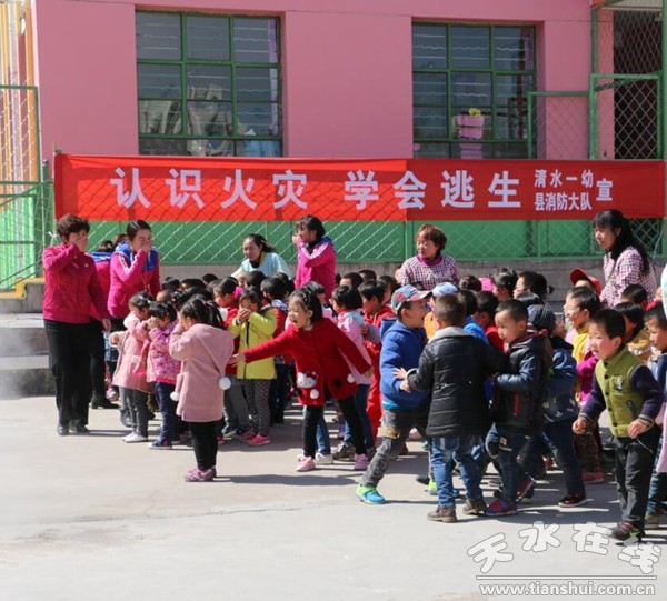 演練前,被聘請(qǐng)為清水縣一幼消防安全校外輔導(dǎo)員的縣消防隊(duì)負(fù)責(zé)人就防火安全工作及滅火器的使用進(jìn)行了詳細(xì)的輔導(dǎo),教師們現(xiàn)場(chǎng)進(jìn)行實(shí)際消火栓滅火操作。消防演練中,各班小朋友們?cè)诶蠋煹闹笇?dǎo)下,雙手用濕毛巾捂著口鼻快速有序的從兩個(gè)樓梯和教室邊門逃生,集合后,孩子們?cè)诶蠋煹膸ьI(lǐng)下安全的疏散到空曠的操場(chǎng)上,各班清點(diǎn)人數(shù),確定無(wú)人“受傷”后宣布演練結(jié)束,整個(gè)演練過(guò)程用時(shí)2分半鐘,整個(gè)演練活動(dòng)緊張有序。