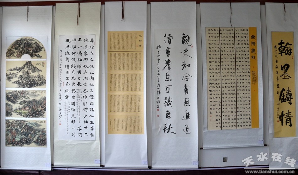 陜甘寧三省十一縣(區(qū))書畫聯(lián)展共展出了來自省內(nèi)華亭縣、張家川縣、莊浪縣、靈臺縣、涇川縣、崆峒區(qū),寧夏回族自治區(qū)涇源縣以及陜西省寶雞市陳倉區(qū)、鳳翔縣三省十一縣(區(qū))各類書畫精品228幅。參觀該展館時,劉天波強調(diào),全縣廣大書畫創(chuàng)作者要按照習近平總書記提出的關(guān)于增強文化自信的要求,結(jié)合縣委、縣政府中心工作,充分挖掘和展示清水深厚的文化底蘊,多出精品力作,提高清水知名度和影響力,促進全縣文化事業(yè)繁榮進步。