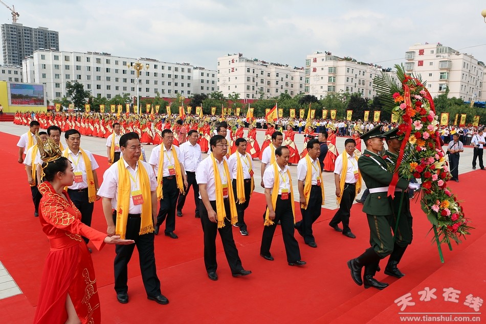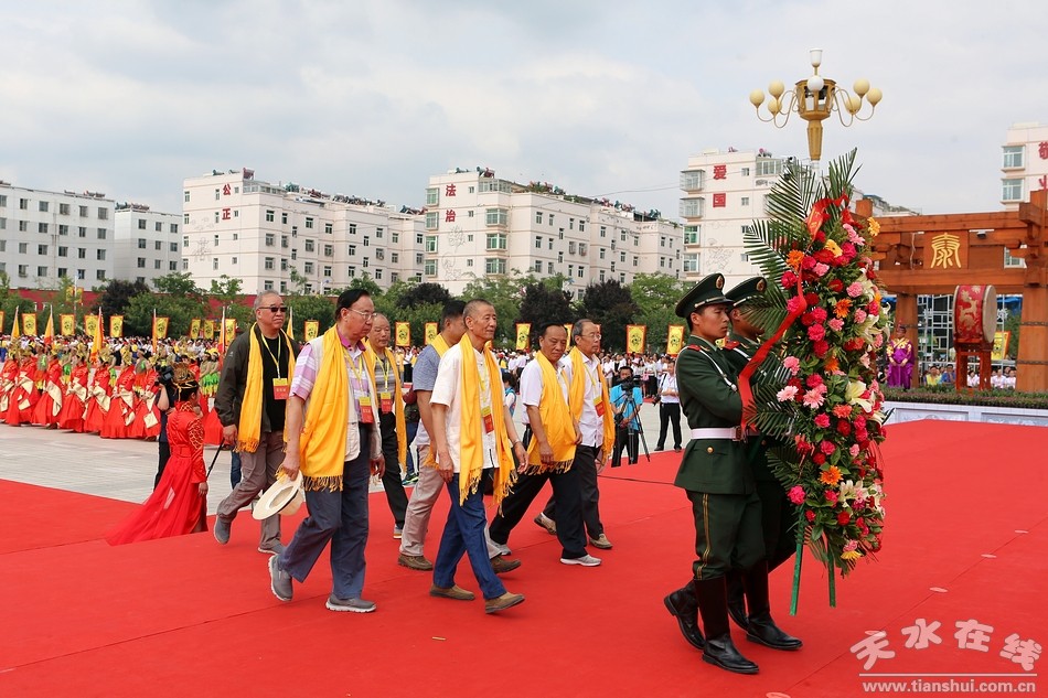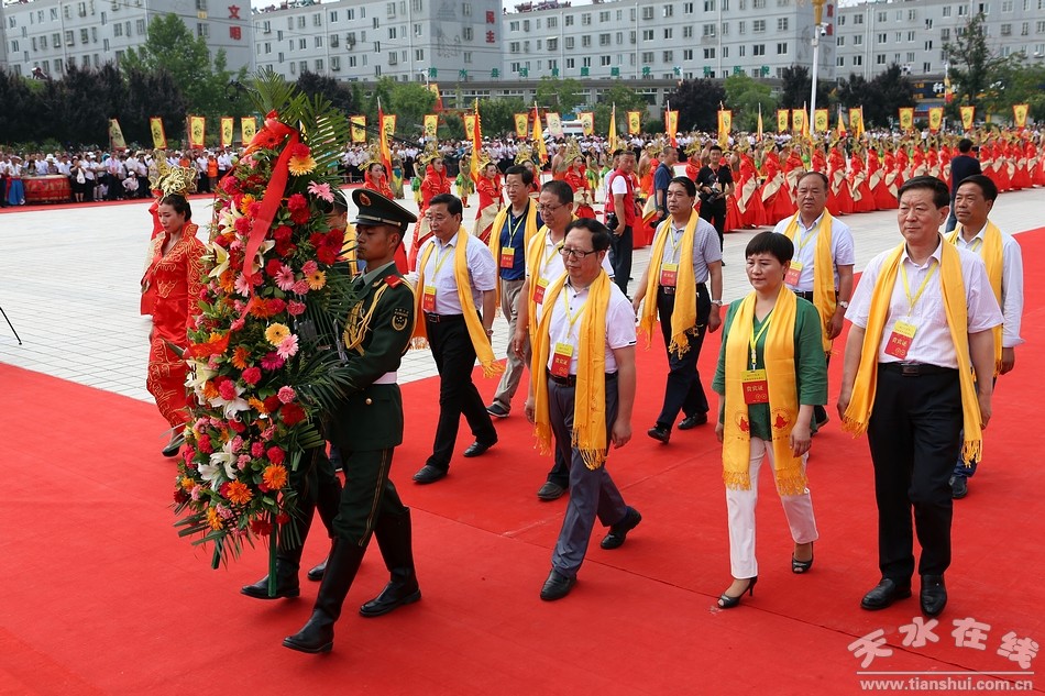 。ㄖ泄蔡焖形瘯浲蹁J,天水市人大常委會(huì)主任王光慶,中共天水市委副書記、市長王軍,政協(xié)天水市委員會(huì)主席張明泰代表市四大組織敬獻(xiàn)花籃。)