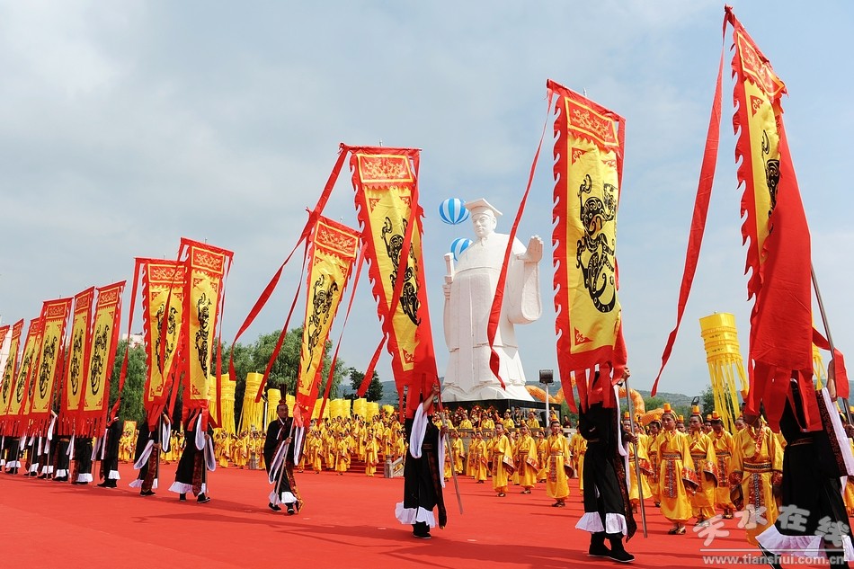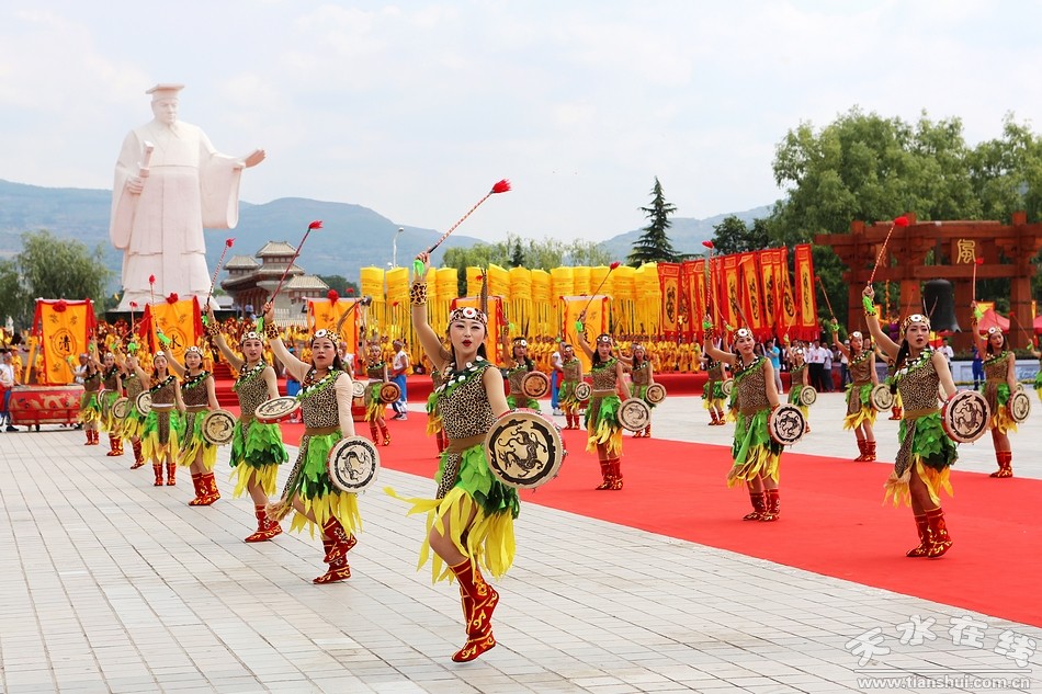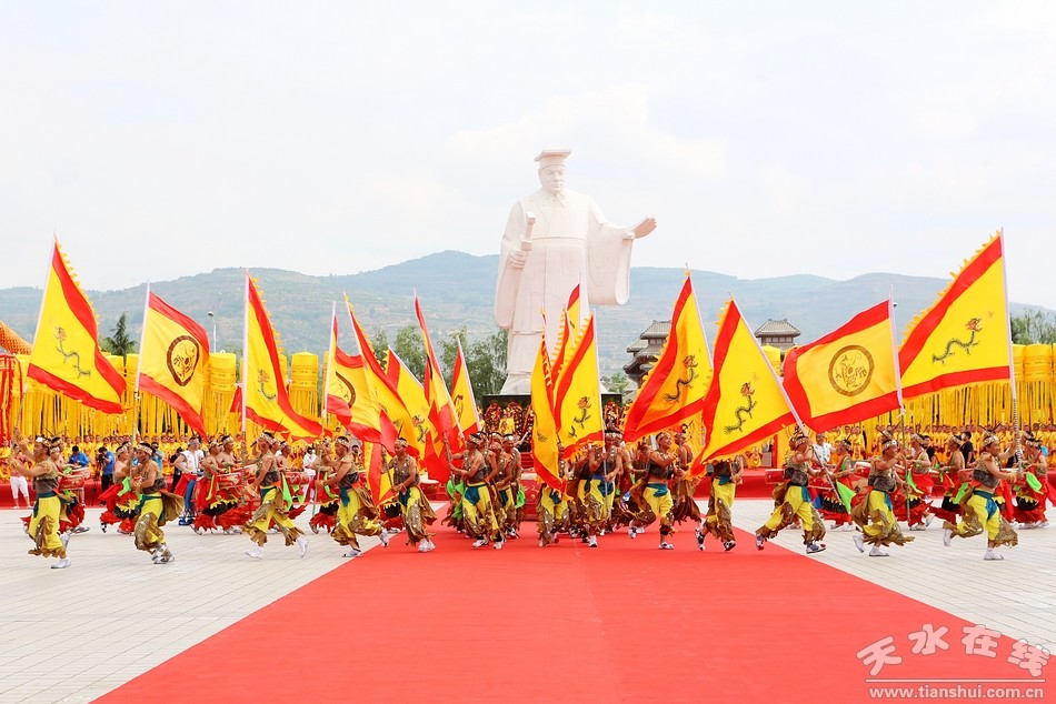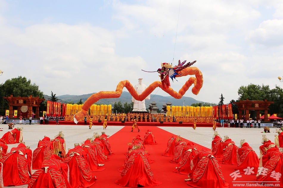 天水市委副書記、市長王軍恭讀祭文;出席祭祀典禮的省、市領(lǐng)導(dǎo)向中華人文初祖軒轅黃帝敬獻(xiàn)花籃;所有來賓面向軒轅黃帝圣像,行三鞠躬禮;來自清水縣軒轅小學(xué)的200多名學(xué)生深情演唱了《黃帝頌》;由89名女青年組成的《樂舞敬拜》,以漢唐風(fēng)格舞蹈語匯為主,貫穿禮、祭、拜、頌四部分,舞蹈舒緩大氣,場(chǎng)面宏大壯觀,氣氛莊嚴(yán)肅穆,感情虔誠崇敬,用唯美的意境展現(xiàn)對(duì)先祖的敬畏,表達(dá)了對(duì)人文初祖軒轅黃帝的追思和敬仰之情。還表演了陣容龐大、氣勢(shì)恢宏的清水《軒轅鼓舞》,《軒轅鼓舞》由黃帝開國、先民生存、萬邦和睦三部分組成,采用清水民間世代流傳的鼓點(diǎn)韻律和舞蹈語言,通過豪邁奔放、簡潔明快的藝術(shù)表演,闡述軒轅文化“敢于斗爭,勇于創(chuàng)造,自強(qiáng)不息”的精神內(nèi)涵,是清水人民對(duì)軒轅黃帝出生清水軒轅谷、發(fā)跡清水軒轅溪、創(chuàng)造人類福祉的深情緬懷和崇高禮贊。祭祀典禮在《巨龍騰飛》中結(jié)束,共同祝愿清水騰飛、天水騰飛、甘肅騰飛、中華騰飛。