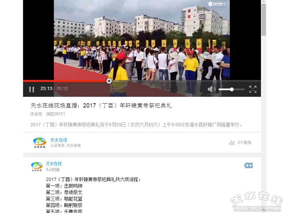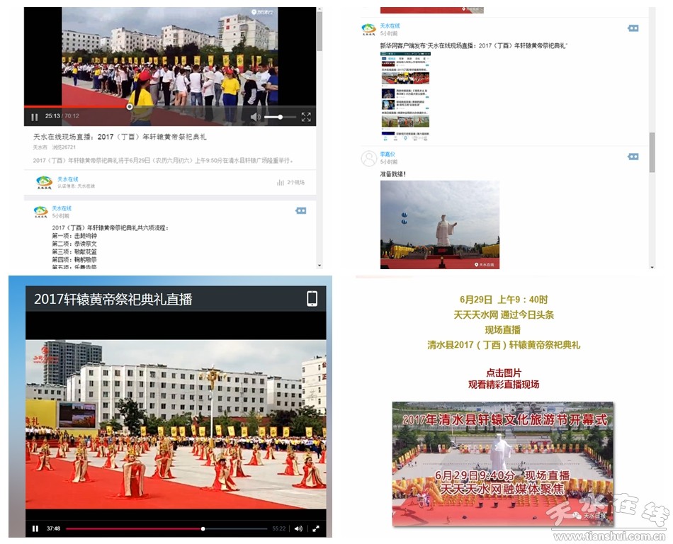 當(dāng)天的祭祀典禮上,西部商報(bào)網(wǎng)視頻、西部商報(bào)網(wǎng)微博、天水在線云平臺(tái)、天天天水網(wǎng)融媒體、天天天水網(wǎng)今日頭條等媒體還進(jìn)行了現(xiàn)場(chǎng)直播,十多萬人同步祭祀,瞻仰敬拜人文初祖軒轅黃帝,共同祈福中華民族繁榮昌盛。同時(shí),清水電視臺(tái)、清水新聞綜合廣播FM106兆赫現(xiàn)場(chǎng)同步也進(jìn)行直播。