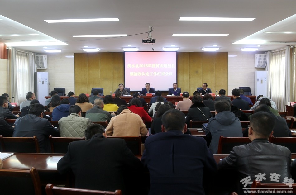 10月25日下午,清水縣召開(kāi)2018年度貧困退出縣級(jí)驗(yàn)收認(rèn)定工作匯報(bào)會(huì)?h委副書(shū)記王新強(qiáng)、李致明,縣人大常委會(huì)副主任周建新,縣政府副縣長(zhǎng)馬小平出席會(huì)議。村戶脫貧指標(biāo)驗(yàn)收認(rèn)定涉及行業(yè)部門(mén)負(fù)責(zé)人,6個(gè)脫貧退出縣級(jí)驗(yàn)收認(rèn)定工作組組長(zhǎng)、成員參加會(huì)議。