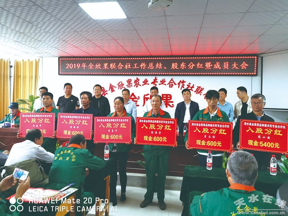 有了穩(wěn)固的根據(jù)地,合作社可以開(kāi)展陣地戰(zhàn)了,周建國(guó)致力于打造一流專(zhuān)業(yè)合作社的理念,不斷創(chuàng)新工作思路,提升服務(wù)質(zhì)量,擴(kuò)大經(jīng)營(yíng)規(guī)模。幾年來(lái)社員由最初的5個(gè)人壯大到349人,吸納了土門(mén)、賈川、金集、郭川、麥積等地的果農(nóng),果園面積也由原來(lái)的幾十畝發(fā)展到現(xiàn)在的18000多畝。2013年6月,合作社申請(qǐng)注冊(cè)了“金欣果”商標(biāo),進(jìn)一步提升了果品知名度,果品產(chǎn)業(yè)向品牌化邁出了一大步。2015年以來(lái),合作社開(kāi)展了“三聯(lián)系四爭(zhēng)創(chuàng)五服務(wù)” 活動(dòng)(黨支部聯(lián)系技術(shù)員、技術(shù)員聯(lián)系會(huì)員、會(huì)員聯(lián)系果農(nóng),爭(zhēng)創(chuàng)十佳“技術(shù)能手、致富模范、創(chuàng)業(yè)標(biāo)兵、服務(wù)先鋒”,開(kāi)展會(huì)員幫建、集中培訓(xùn)、科技推廣、入股建園、統(tǒng)購(gòu)統(tǒng)銷(xiāo)五項(xiàng)服務(wù)),不斷強(qiáng)化黨建示范引領(lǐng),助推精準(zhǔn)扶貧精準(zhǔn)脫貧。