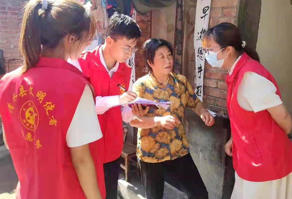 (志愿者在居民小區(qū)入戶排查疫苗接種情況、宣傳普及疫苗接種知識(shí))