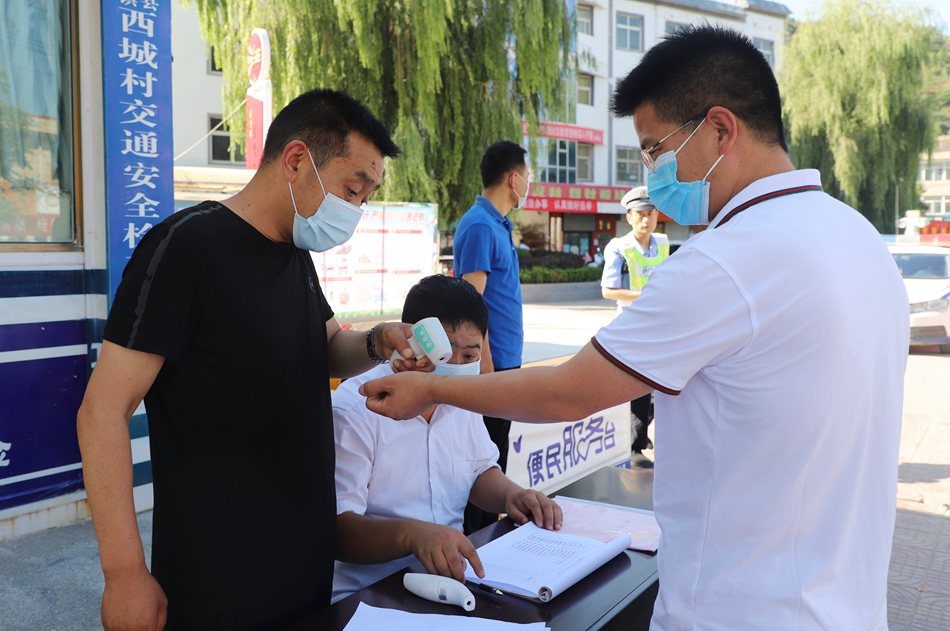 (工作人員在紅堡鎮(zhèn)疫情防控監(jiān)測點(diǎn)對(duì)來清人員測量體溫)