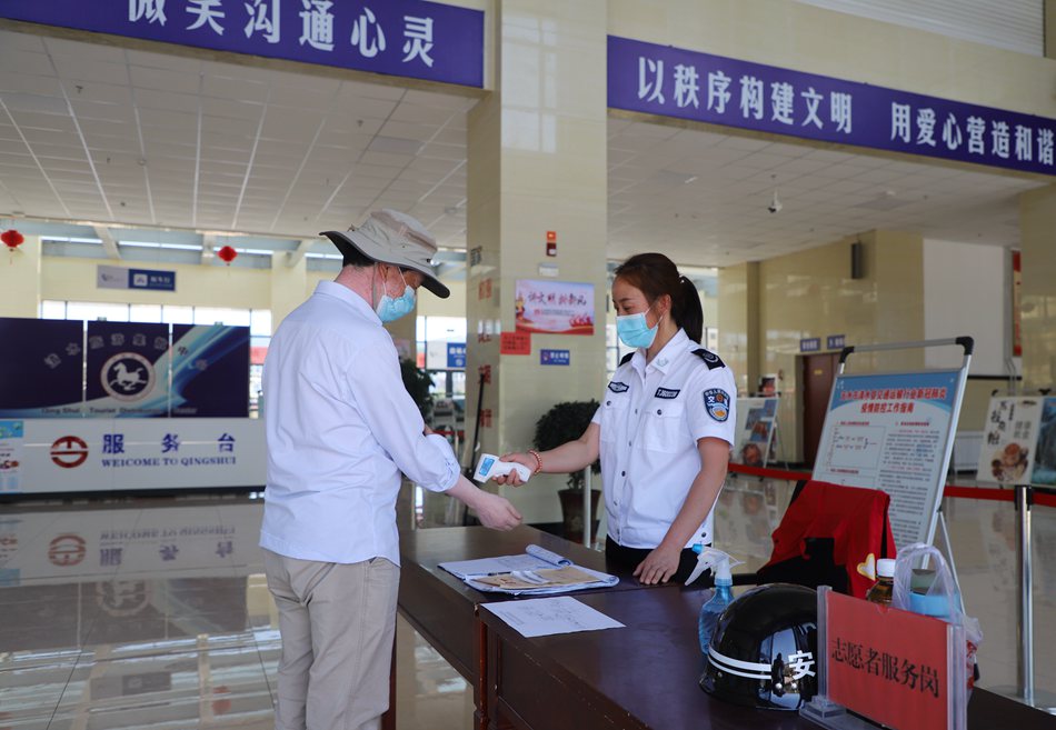 (清水縣汽車站工作人員對(duì)進(jìn)站乘客測量體溫)