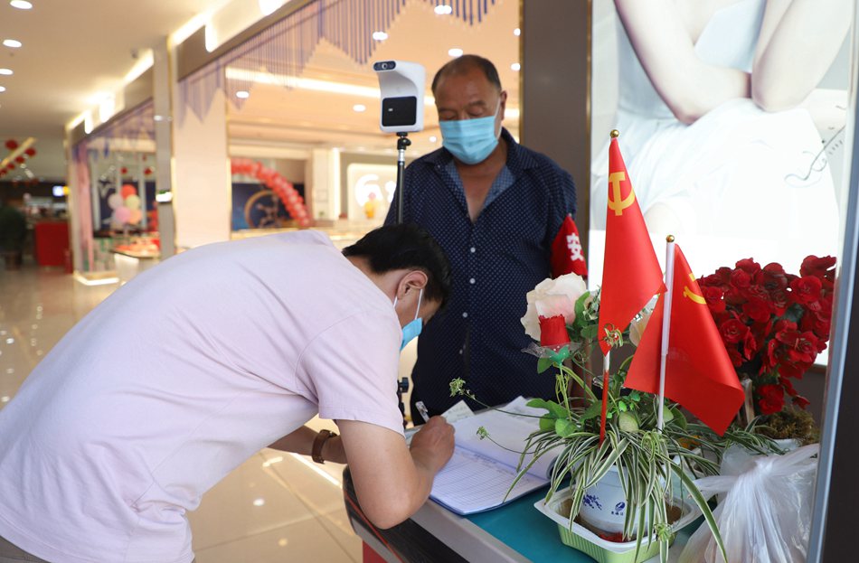 (家樂超市工作人員對(duì)進(jìn)入超市人員測量體溫并登記信息)