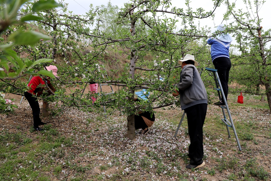 在果園里,果農(nóng)在嫻熟地給蘋果樹疏花,為今年蘋果豐產(chǎn)豐收打下堅(jiān)實(shí)基礎(chǔ)。