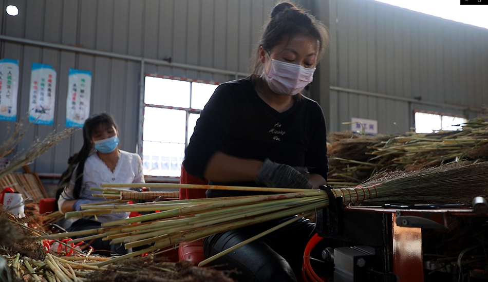 走進徐芳成的加工車間,濃郁的秸稈清香撲鼻而來,寬敞明亮的廠房內(nèi)一派繁忙的景象,工人們正嫻熟地扎制著掃帚。廠房外,晾曬著剛做好的高粱掃帚,整齊擺放的掃帚上密密麻麻地裹纏著綠色的線繩。在加工的隊伍中,老年人和婦女居多,他們無法外出務工,在家門口加工掃帚成為了他們增收致富的好門路。
