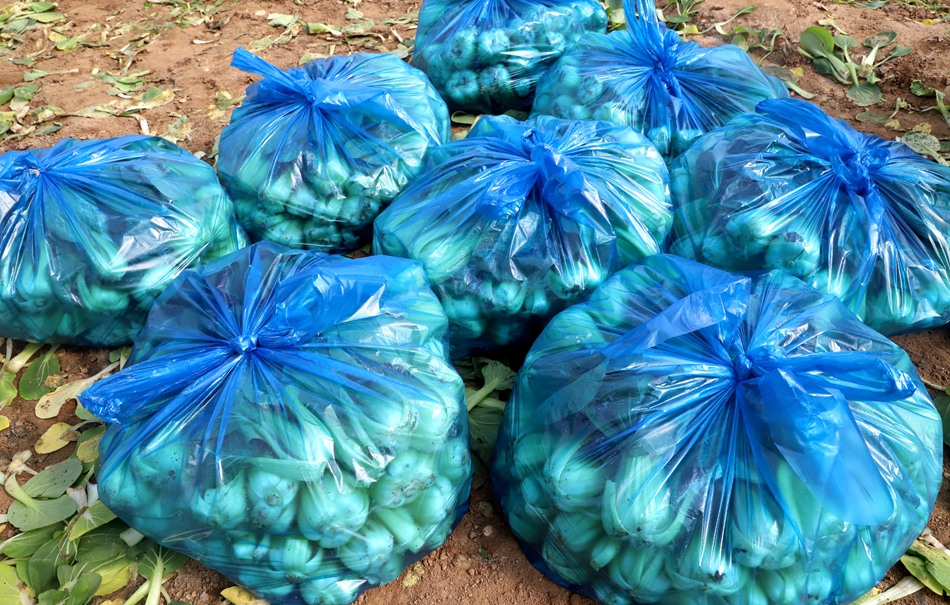 蔡志學正在和家人一起鏟菜、稱重、裝袋!拔页邪藞@區(qū)六座棚,種植蔬菜,產(chǎn)量非常好,價格也不錯,批發(fā)到周邊縣區(qū)的超市,每座大棚產(chǎn)量大約4000斤,經(jīng)濟效益很好!辈讨緦W笑著說。