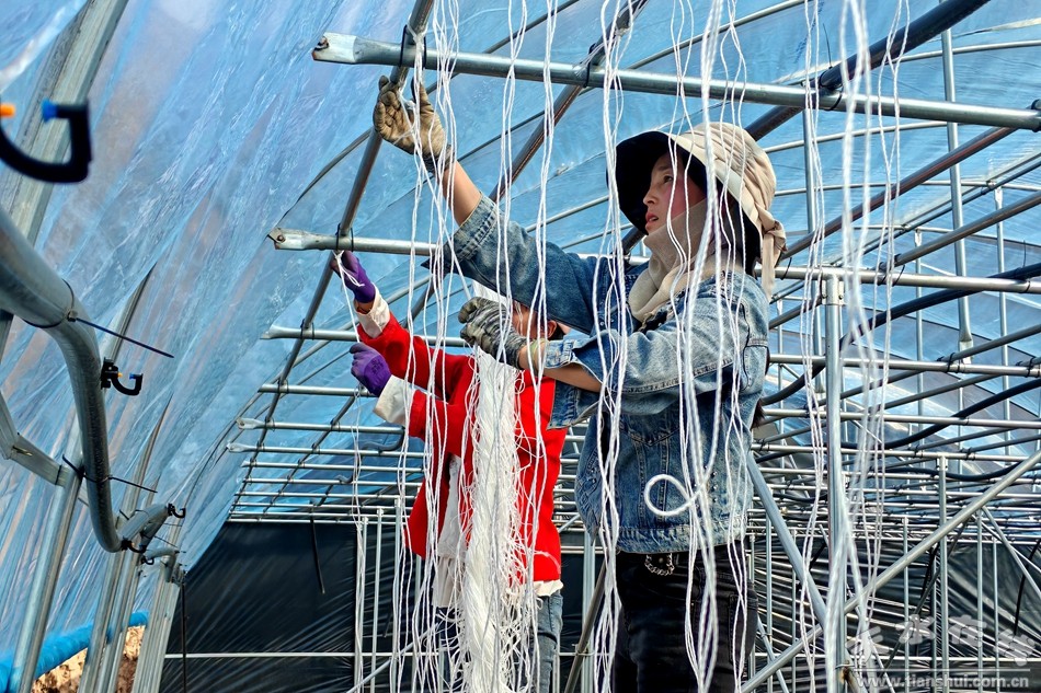 走進(jìn)新城鄉(xiāng)四合村黑木耳種植基地,村民正在進(jìn)行掛繩工序,為大棚投入使用做最后的準(zhǔn)備。