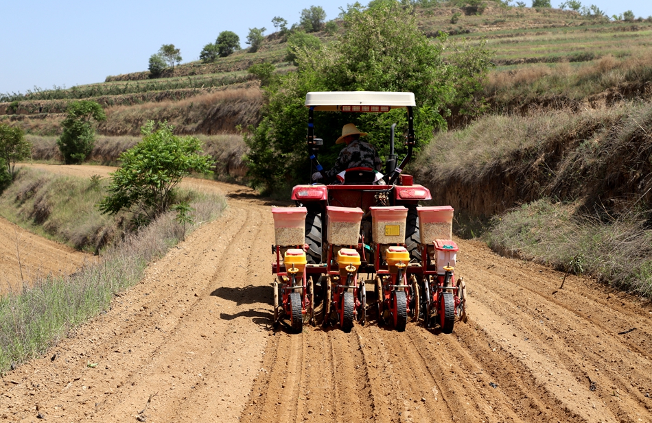 走進土門鎮(zhèn)高廟村高標準農(nóng)田,伴隨著陣陣機械的轟鳴聲,大型旋耕機在地里來回穿梭,進行第二輪翻犁,播種機緊隨其后將一粒粒高粱種播種到地里,田間地頭滿滿的“科技范”。