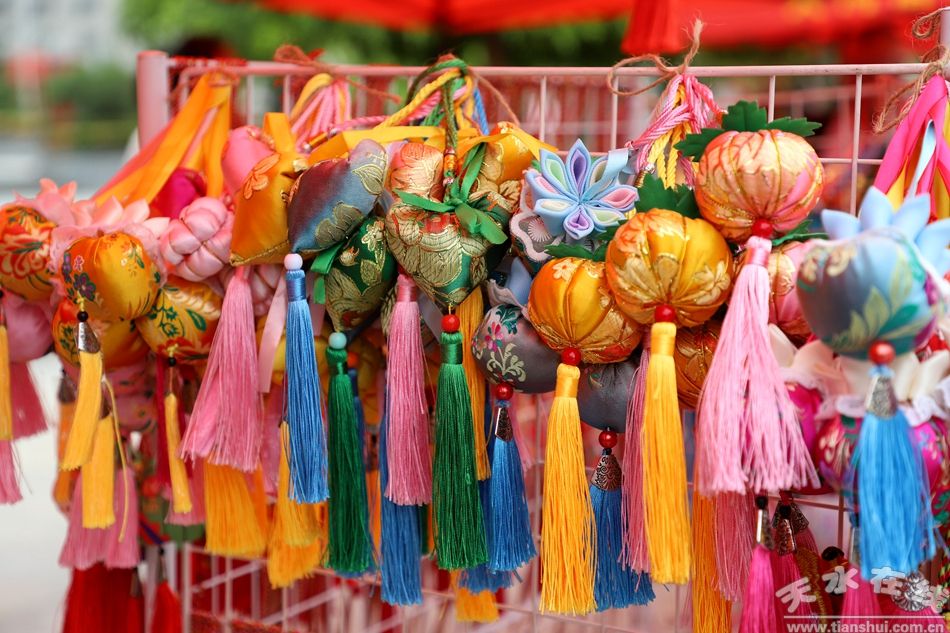 孩子們?cè)谶@個(gè)節(jié)日里,也是滿(mǎn)心歡喜。大人們用絲線搓成五彩花繩,纏在孩子們的手腕和腳腕上。五彩花繩在陽(yáng)光下閃爍著斑斕的色彩,宛如一道道絢麗的彩虹。在民間傳說(shuō)中,綁上花線便能避五毒,庇佑孩子們健康成長(zhǎng)。孩子們戴上花繩,如同獲得了一件神奇的護(hù)身符,滿(mǎn)心歡喜地在街巷中奔跑嬉戲,手中還揮舞著剛從集市上買(mǎi)來(lái)的小香囊。香囊用五彩絲線繡成,繡工精細(xì),圖案精美,里面填充著雄黃、艾草、菖蒲等香料,散發(fā)著淡雅的香氣。將香囊掛在胸前、腰間,不僅能驅(qū)邪避蟲(chóng),還為孩子們的節(jié)日裝扮增添了幾分俏皮與可愛(ài)。