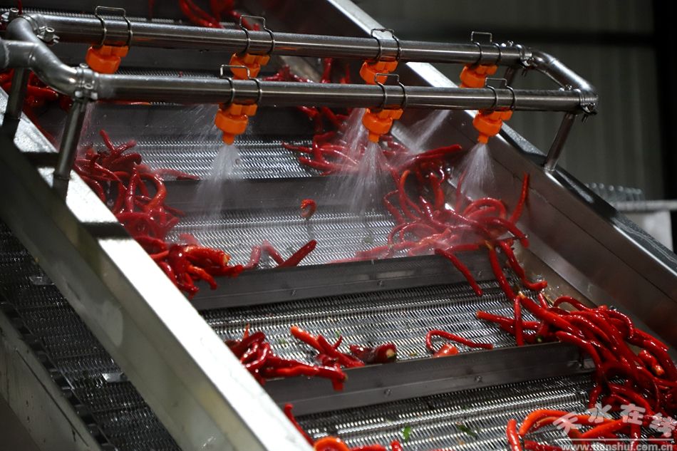 在加工區(qū)域,現(xiàn)代化設(shè)備正高效運(yùn)轉(zhuǎn)。辣椒在高壓噴淋清洗機(jī)中被沖刷干凈,通過傳送帶進(jìn)入分揀環(huán)節(jié),工人們配合機(jī)器完成品質(zhì)分類后,大型加工設(shè)備將辣椒研磨破碎,為后續(xù)辣椒醬、辣椒油等深加工產(chǎn)品的生產(chǎn)作好準(zhǔn)備。機(jī)器的精準(zhǔn)運(yùn)轉(zhuǎn)與工人的嫻熟操作無縫銜接,讓“小辣椒”的附加值在一道道工序中不斷提升。