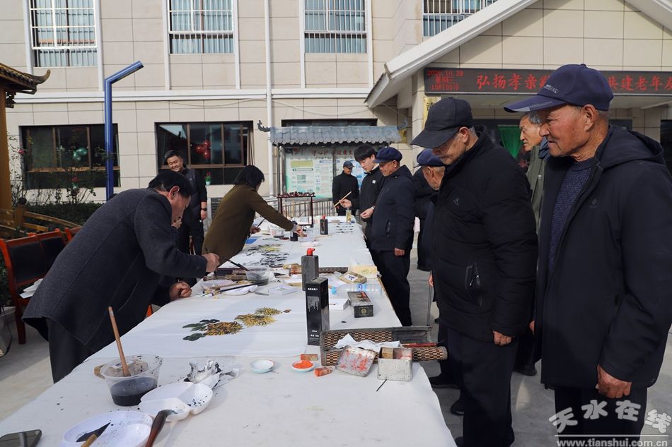 下午,福利院內(nèi)墨香四溢,“九九重陽·幸福安康”書畫作品贈(zèng)送活動(dòng)拉開帷幕。縣文聯(lián)的書畫家們揮毫潑墨,或?qū)懴隆案劭祵帯薄八生Q延年”等吉祥話語,或勾勒出蒼勁的松柏、靈動(dòng)的仙鶴,現(xiàn)場(chǎng)贈(zèng)送給老人。老人們或駐足圍觀創(chuàng)作過程,或輕聲交流作品意趣,墨香與笑聲交織,盡顯文化敬老的溫情。