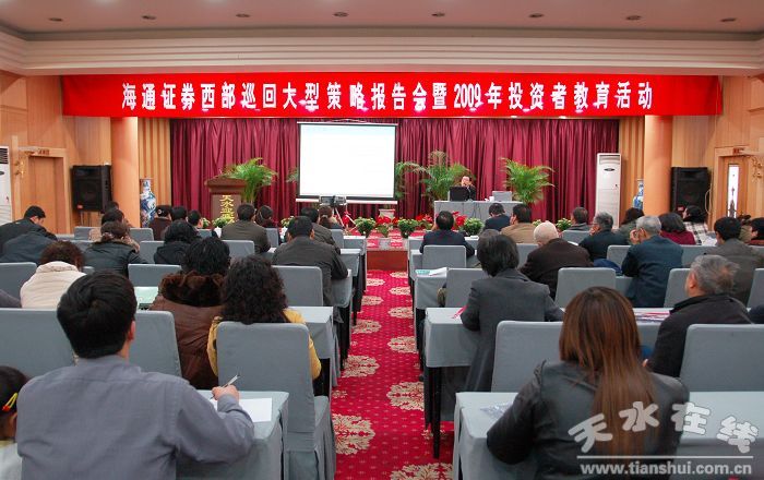 3月7日下午,天水市迎賓館迎賓酒樓二樓會(huì)議室座無虛席。海通證券西部巡回大型策略報(bào)告會(huì)暨2009年投資者教育活動(dòng)正在這里隆重舉行。海通證券投資理財(cái)中心投資總監(jiān)王漢東先生為我市廣大投資者上了生動(dòng)的一課。