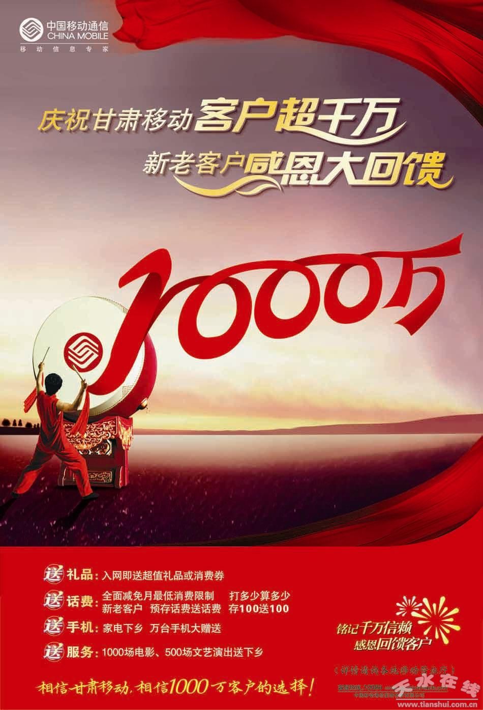 為回報社會,回饋每一位客戶,甘肅移動在客戶總數(shù)超過1000萬之際,特推出“客戶超千萬感恩回饋新老客戶”大型系列活動,并將通過傾力打造“便捷服務(wù)、滿意100”客戶服務(wù)工程,向客戶提供六項(xiàng)更加便捷、更加優(yōu)質(zhì)的服務(wù);加大網(wǎng)絡(luò)建設(shè)覆蓋和優(yōu)化力度,加快城區(qū)無線網(wǎng)絡(luò)升級改造,提高對新業(yè)務(wù)和信息化業(yè)務(wù)的承載能力,加大對農(nóng)村地區(qū)的網(wǎng)絡(luò)覆蓋,打造高效節(jié)能型的綠色生態(tài)網(wǎng)絡(luò);發(fā)揮通信運(yùn)營業(yè)在文化產(chǎn)業(yè)鏈中的推動作用,助力地方信息化建設(shè),引領(lǐng)甘肅信息服務(wù)業(yè)的發(fā)展,推動移動信息產(chǎn)業(yè)和傳媒、金融、物流、商務(wù)等行業(yè)的融合;積極實(shí)施“信息下鄉(xiāng)、信息進(jìn)村”等惠農(nóng)工程,組建“農(nóng)村信息網(wǎng)”,幫助建立農(nóng)產(chǎn)品網(wǎng)上市場,通過農(nóng)信通、科技110、移動氣象站等平臺為農(nóng)民提供各類實(shí)用信息等,完善農(nóng)村學(xué)校信息化教學(xué)設(shè)施,開展中小學(xué)“遠(yuǎn)程教育”等回饋助建活動,不斷完善和提升甘肅移動的服務(wù),不斷為客戶創(chuàng)造更大的價值,讓客戶享受實(shí)實(shí)在在的關(guān)愛,享受實(shí)惠。