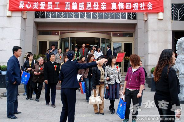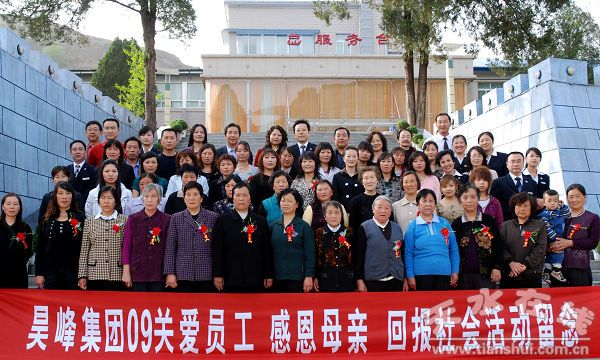 “世界上只有一位最好的女性,她便是善良的母親;世界上只有一個最崇高的名字,那便是慈愛的母親;世界上只有一種最美的聲音,那便是母親的呼喚!卑殡S著舒緩的鋼琴曲和深情的呤頌,2009年昊峰集團(tuán)優(yōu)秀員工母親代表歡度母親節(jié)活動在親情濃濃的氛圍中拉開了帷幕。30多名來自昊峰集團(tuán)15個子公司的優(yōu)秀員工代表各自手挽著自己的母親,在昊峰集團(tuán)董事長總經(jīng)理程俊峰的陪同下,興致勃勃地參觀了綠島大酒店、麥積京來順肥牛美食城、天河酒業(yè)清水酒廠、清水溫泉度假村等昊峰集團(tuán)下屬實(shí)體,在母親節(jié)里形成了一道別樣的風(fēng)景。