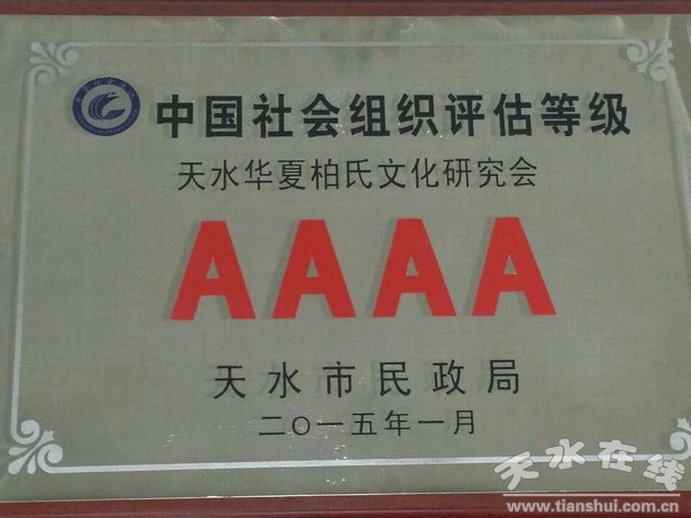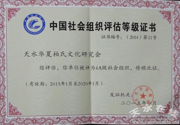 近日,在天水市第三批市屬社會組織評估活動中,華夏柏氏文化研究會被評為4A級中國社會組織。