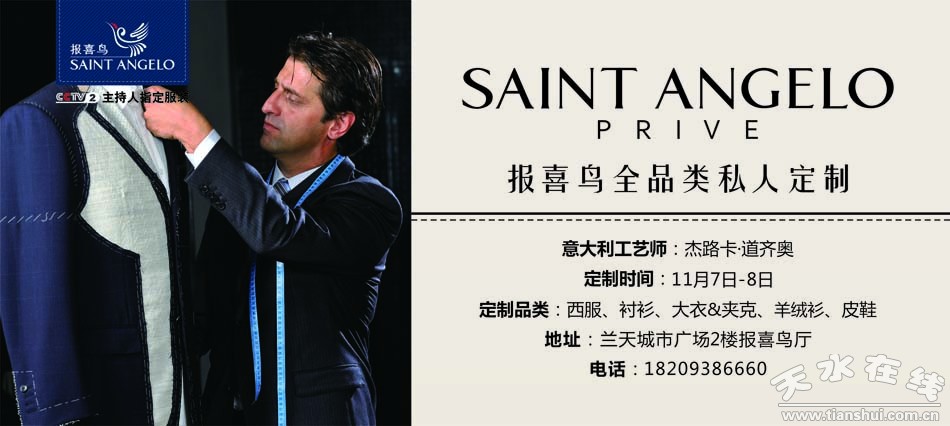 報(bào)喜鳥(niǎo),以寵愛(ài)男人之名,締造高貴、儒雅、精致格調(diào),全品類,個(gè)性化,奢華尊享“自我價(jià)值”著裝時(shí),2015年11月7日-8日,天水蘭天城市廣場(chǎng)2樓報(bào)喜鳥(niǎo)廳攜手意大利量體工藝師杰路卡•道齊奧,為天水紳士奉上一道定制盛宴,量體打造專屬的尊貴個(gè)性,敬請(qǐng)期待!