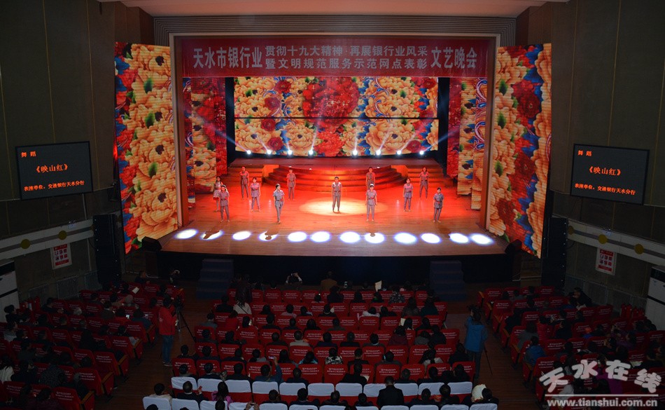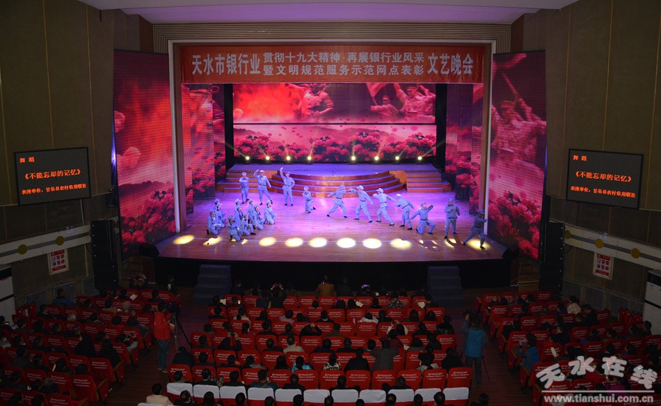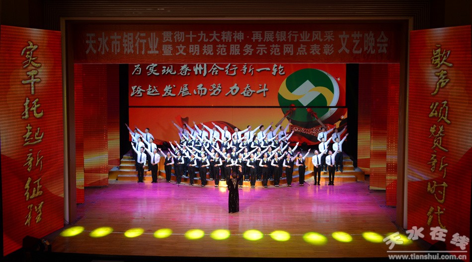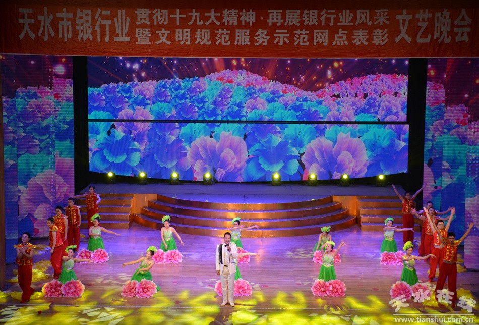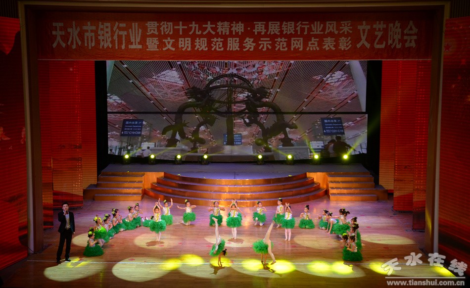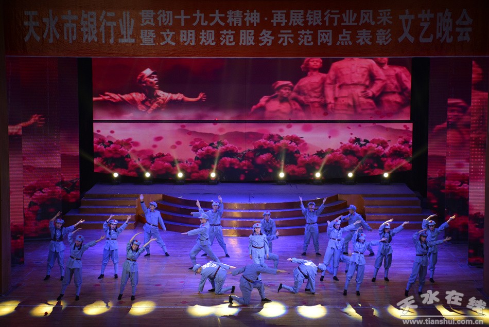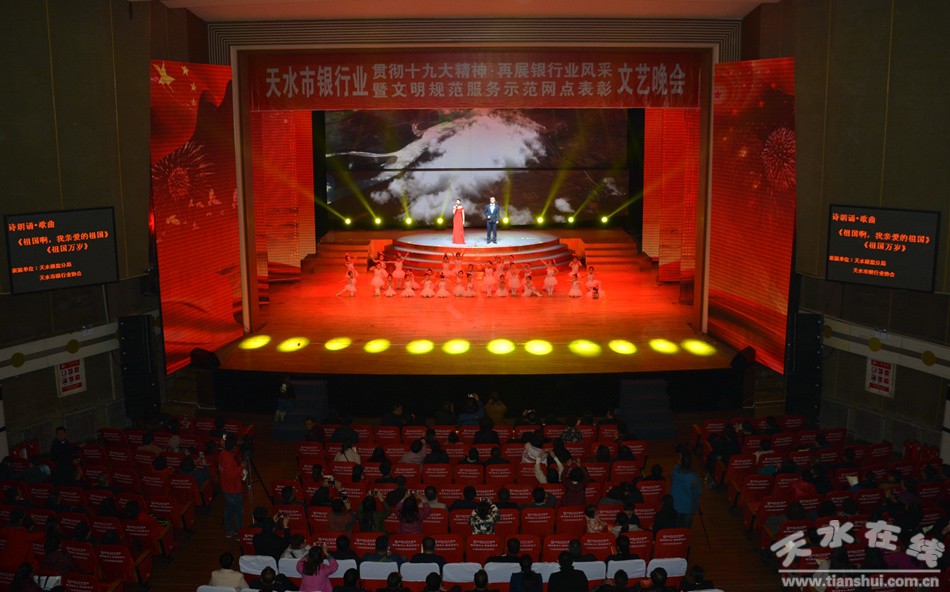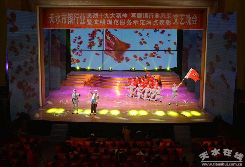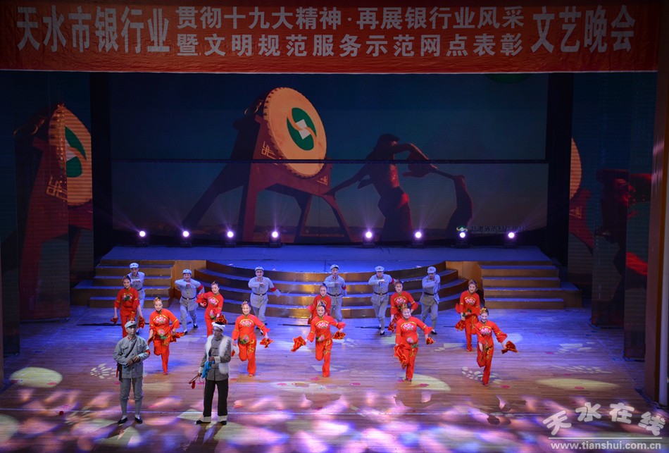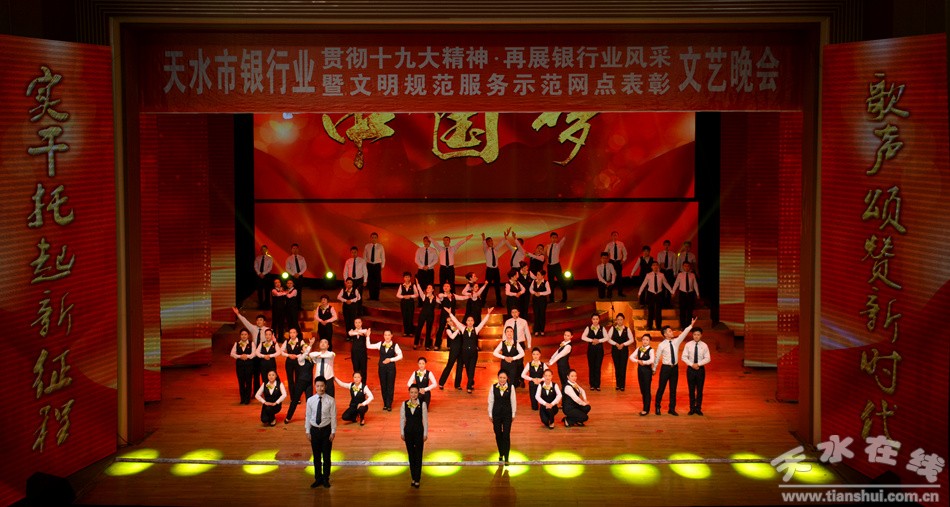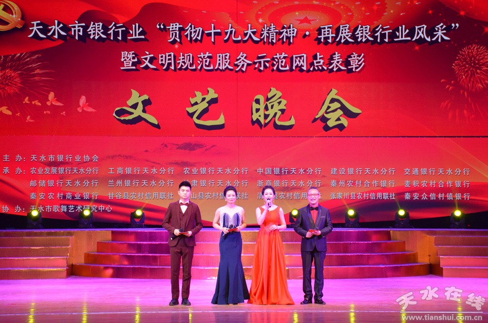 11月13日晚,由天水市銀行業(yè)協(xié)會(huì)主辦的“貫徹十九大精神 再展銀行業(yè)風(fēng)采”暨文明規(guī)范服務(wù)示范網(wǎng)點(diǎn)表彰文藝晚會(huì)在秦州大劇院舉辦。晚會(huì)上表彰了18家由市文明辦、市銀協(xié)評(píng)選出的示范網(wǎng)點(diǎn),市銀協(xié)會(huì)員單位表演了大合唱、歌伴舞、舞蹈、情景劇《歌唱祖國(guó)》、《不忘初心》、《盛世花開》等19個(gè)精彩的文藝節(jié)目。副市長(zhǎng)程偉東出席晚會(huì)并頒獎(jiǎng)。
