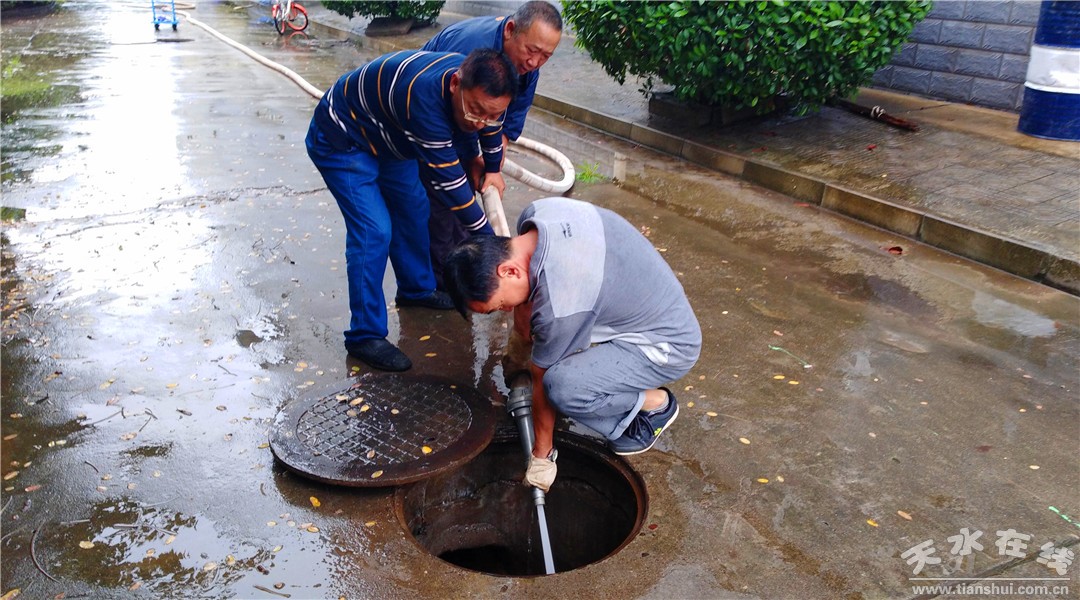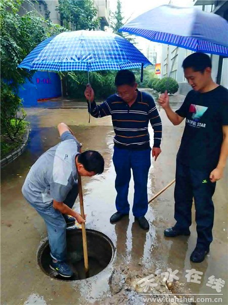 汛情就是命令,防汛就是責(zé)任。公司黨委副書記、工會主席白峰第一時(shí)間趕往現(xiàn)場,并與聞訊趕來的物業(yè)公司副經(jīng)理樊榮奇、劉鋼,物業(yè)公司職工謝自樂,保衛(wèi)部職工司琪一起,迅速掌握現(xiàn)場情況,并制定了冒雨疏通排水管道的應(yīng)急預(yù)案。