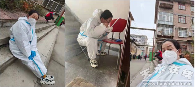 作為鍛壓家園物業(yè)服務(wù)人員,這對亦師亦友的同事,日常的工作就是為住戶買水買電,遇到行動不便的老人,他們都會上門服務(wù),幫助刷電卡水卡。自小區(qū)管控后,她們二人看到單位人手不夠,主動請纓,并肩戰(zhàn)斗,同進同退,舍小我而顧大局,堅守在抗疫第一線。每天值班十二小時以上是常態(tài),小區(qū)內(nèi)來回巡視、消殺,一天下來雙腿僵硬,偶爾坐在路邊揉一揉發(fā)酸的小腿,然后繼續(xù)投入到防控工作中。