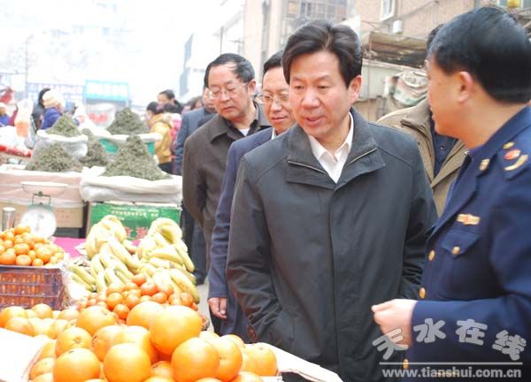 每到一處,張明泰都要詳細詢問市場商品的價格是否穩(wěn)定、節(jié)前商品供應(yīng)是否充足、商品的進貨渠道是否規(guī)范、質(zhì)量是否合格,并向消費者詳細詢問商品價格等情況。在天水綜合批發(fā)市場肉類商場,當(dāng)一位正在購買過年肉的老大爺告訴他,今年的豬肉價格不但比去年低,而且都有衛(wèi)生防疫部門的檢疫標(biāo)志,吃起來很放心時,張明泰說,我們今天組織有關(guān)部門來檢查,就是看看有沒有不合格的商品,就是要讓老百姓吃上放心肉,過個安心年。