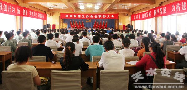 。ㄇ刂輩^(qū)外宣辦 辛志鋒)7月15日下午,秦州區(qū)召開雙擁工作命名表彰大會(huì)。會(huì)議主要內(nèi)容是總結(jié)近年來該區(qū)雙擁工作取得的成績和經(jīng)驗(yàn),安排部署今后一個(gè)時(shí)期雙擁創(chuàng)建工作。會(huì)議還對做出優(yōu)異成績的玉泉鎮(zhèn)等13個(gè)鄉(xiāng)鎮(zhèn)和街道辦事處、玉泉鎮(zhèn)暖和灣村等32個(gè)擁軍優(yōu)屬模范村,西關(guān)街道辦事處西站社區(qū)等16個(gè)擁軍優(yōu)屬模范社區(qū),區(qū)教育局等24個(gè)擁軍優(yōu)屬先進(jìn)單位,68202部隊(duì)42分隊(duì)等9個(gè)擁政愛民先進(jìn)單位,班來存等24名雙擁先進(jìn)個(gè)人予以表彰。