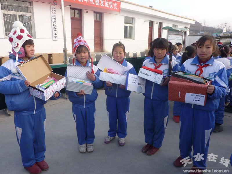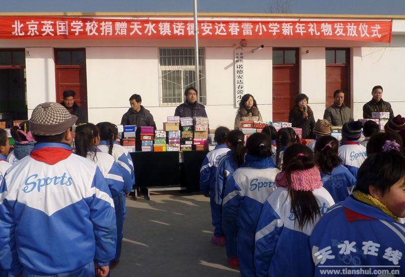 新年臨近,北京英國學校的師生把他們最珍愛的禮物,委托秦州區(qū)婦聯(lián)送給天水鎮(zhèn)諾德安達春蕾小學的全體師生。12月28日,在天水鎮(zhèn)諾德安達春蕾小學舉行了新年禮物發(fā)放儀式,在發(fā)放儀式上,秦州區(qū)婦聯(lián)的領導將北京英國學校孩子們送來的帽子、手套、糖果、文具等愛心禮物送到了每位師生手中。并希望天水鎮(zhèn)諾德安達春蕾小學的師生珍惜這份來之不易的友誼,奮發(fā)努力,勤學進取,用優(yōu)異的成績感謝英國諾德安達教育集團和北京英國學校師生的關懷和厚望。
