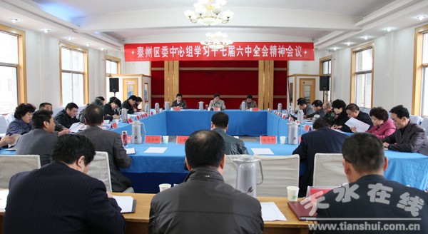 (秦州區(qū)外宣辦 彭高峰)10月24日上午,秦州區(qū)委中心組召開學(xué)習(xí)十七屆六中全會精神會議,集體學(xué)習(xí)了《中國共產(chǎn)黨第十七屆中央委員會第六次全體會議公報(bào)》和人民日報(bào)社論文章《邁向社會主義文化強(qiáng)國的偉大進(jìn)軍》。