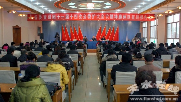 (秦州區(qū)外宣辦 劉可)12月14日,省委十一屆十四次全委擴大會議精神宣講團在秦州區(qū)作宣講報告。甘肅政法學院行政學院院長、教授馬進,市委宣傳部副部長、市社科聯(lián)常務副主席漆應得,區(qū)委常委、宣傳部長劉小平出席會議。全區(qū)宣傳文化系統(tǒng)及各街道黨員干部共200余人聆聽了宣講報告。報告會由劉小平主持。