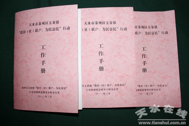 為了使“聯(lián)村聯(lián)戶、為民富民”行動取得扎實成果。形成長效機制,讓每個干部對幫扶戶及幫扶措施做到心中有數(shù)、扎實推進。玉泉鎮(zhèn)從鎮(zhèn)情實際出發(fā),不斷創(chuàng)新工作方式方法,印制秦州區(qū)玉泉鎮(zhèn)“聯(lián)村聯(lián)戶、為民富民”行動工作手冊下發(fā)每位干部,確保這次行動取得扎實成效。