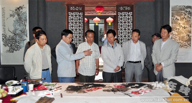 (秦州區(qū)文聯(lián))6月5日,應邀前來的北京著名書畫家李長貴先生與秦州文藝界的書畫家進行了書畫交流筆會市委常委、秦州區(qū)委書記張明泰在百忙中看望李長貴并與參加活 動的人員合影留念。區(qū)委常委、宣傳部長劉小平參加了筆會活動。