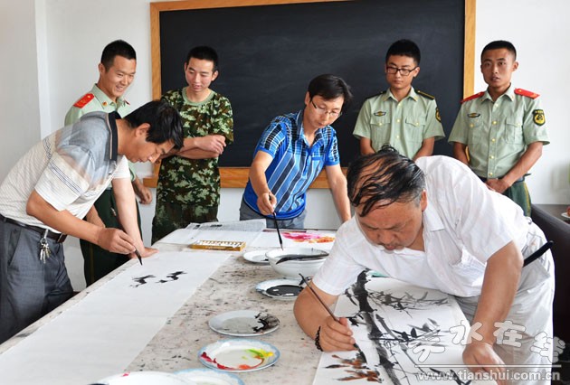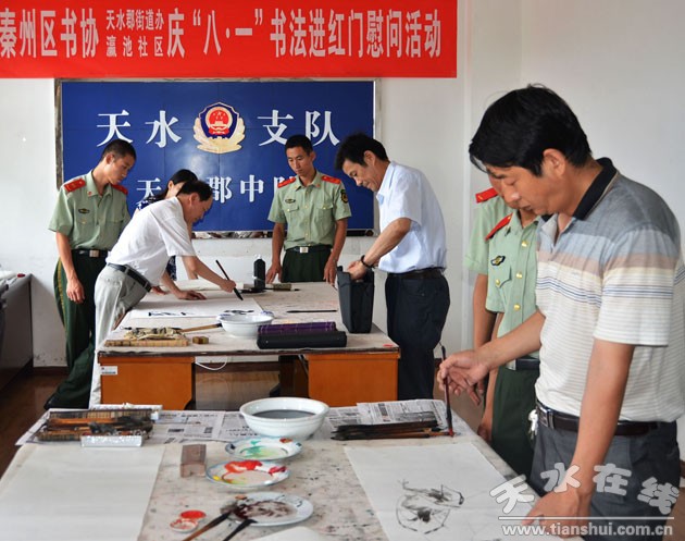 7月30日,秦州區(qū)文聯(lián)組織書畫家一行十余人前往天水郡消防中隊慰問消防官兵。天水郡街道辦事處和瀛池社區(qū)配合并參加了這次活動。